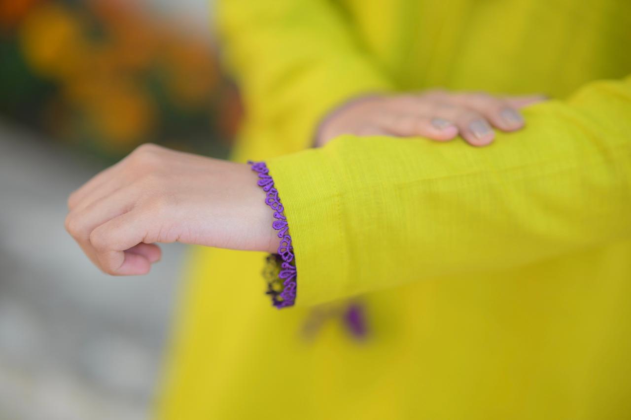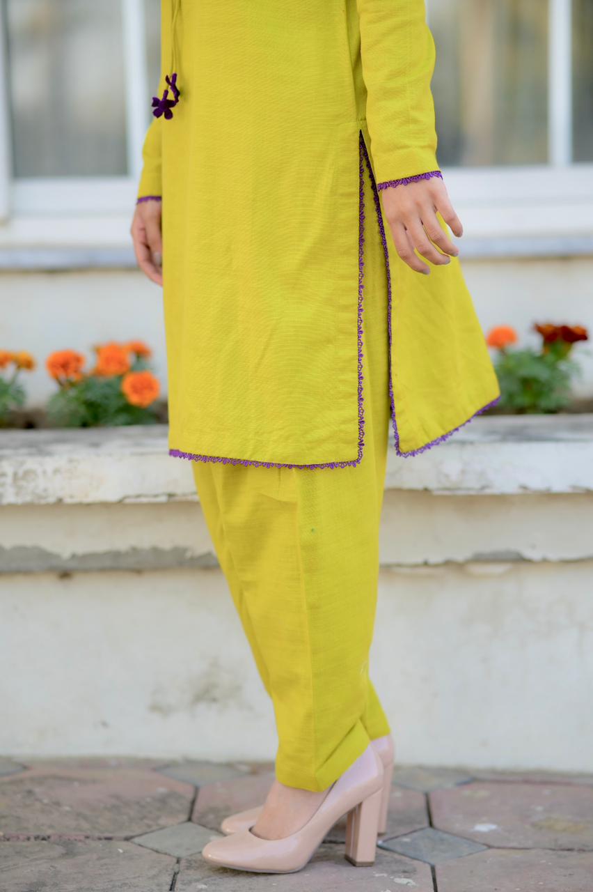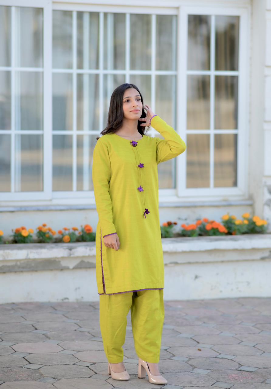 Keeping it cozy yet chic in this lime-dew khaddar suit. The deep purple lace detailing on the sleeves and neck adds just the right amount of contrast for the season. Ready to wear and ready to glow!